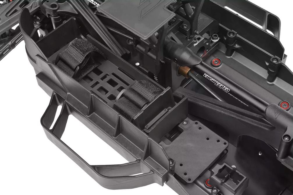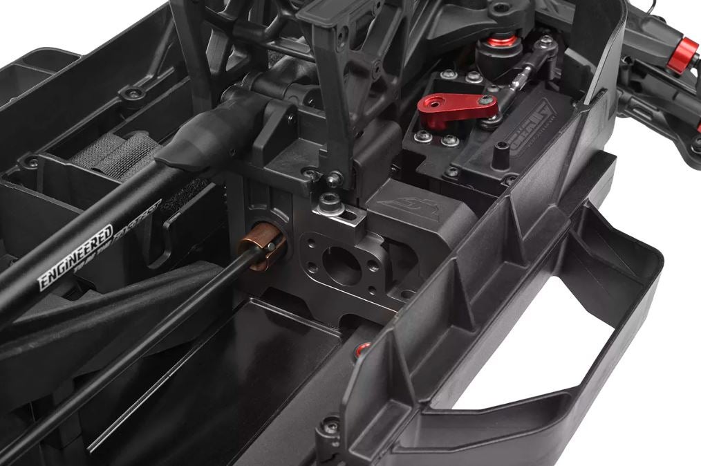 SHIROIn ytimessä on 3 mm CNC-koneistettu alumiinirunko, jota vahvistaa tornista torniin ulottuva poikittaistuki sekä korkeat komposiittiset sivusuojat. Tämä jäykkä selkäranka on tehty kestämään nopeat lähdöt, röykkyisen maaston ja vaativat alastulot. Luodinkestävä teräksinen voimansiirto CNC-leikatuilla rattailla, kolme öljytäytteistä tasauspyörästöä ja kestävät CVD-vetoakselit varmistavat maksimaalisen hyötysuhteen ja luotettavuuden sekä 4S- että 6S-LiPoilla.